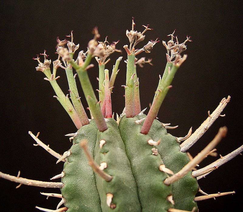Blühende Pflanze (weiblich) 3 Cyathien 4 Früchte 5 Dornen |